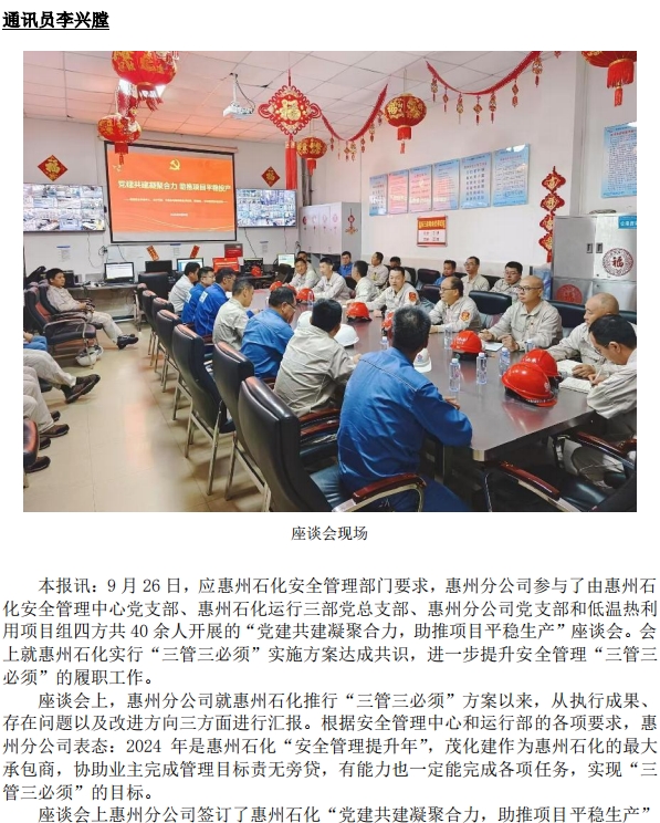 惠州分公司與業(yè)主開展 “黨建共建凝聚合力,助推項目平穩(wěn)生產”座談會